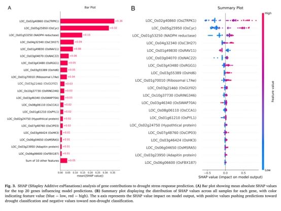 王华锋教授团队面临着一个生物学难题:如何从水稻数万个基因中找出那些真正控制抗旱性的关键基因?研究团队收集了来自9项独立研究的158个水稻转录组样本,覆盖不同抗旱性的水稻品种。他们训练了三种不同的机器学习模型——随机森林、XGBoost和前馈神经网络,旨在找出基因表达模式与抗旱性之间的隐藏关联。在三种模型中,XGBoost表现出最卓越的性能,不仅达到了90%的分类准确率,AUC值(曲线下面积)更是高达0.97,显示出极佳的预测能力。通过可解释AI技术,研究人员量化了每个基因对模型预测的贡献度,从而识别出最具影响力的抗旱响应基因。