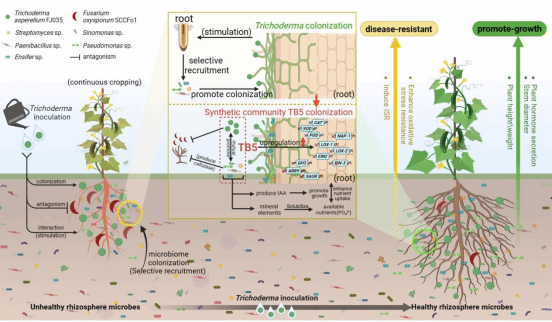图3:棘孢木霉FJ035招募根际微生物群来增强抗黄瓜枯萎病和促进生长的模式图
