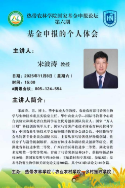 2025年11月8日下午,由热带农林学院(农业农村学院、乡村振兴学院)主办的国家自然科学基金项目申报交流论坛第六期顺利举行。本期讲座邀请了国家“万人计划”科技创新领军人才、国家马铃薯产业技术体系育种岗位科学家、华中农业大学宋波涛教授担任主讲人,会议由王睿副院长主持,采取线上方式进行。