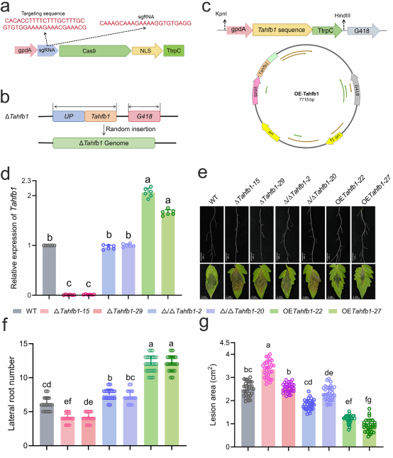 在自然环境中,植物常需在快速生长(占据资源)与强化防御(抵抗病原)之间进行权衡。团队前期研究发现棘孢木霉不仅能促进番茄根系生长,还能增强其对灰霉病的抗性。基于转录组分析,团队锁定了在与番茄互作中高表达的疏水蛋白基因Tahfb1。外源施加Tahfb1蛋白可显著促进番茄侧根发育,并有效减少灰霉病感染导致的病斑面积(图1)。