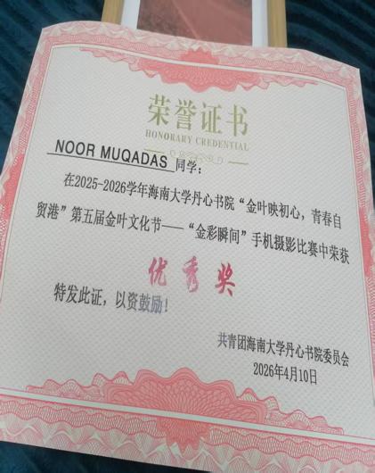 近日,海南大学丹心书院成功举办2025-2026学年“金叶映初心,青春自贸港”第五届金叶文化节系列活动之“金彩瞬间”手机摄影比赛。经过作品征集与评选,最终评审结果于4月10日正式揭晓,并举行证书颁发仪式。其中,海南大学热带农林学院国际学生NOOR MUQADAS同学凭借出色的摄影作品脱颖而出,荣获本次比赛优秀奖。共青团海南大学丹心书院委员会为其颁发荣誉证书,以资鼓励。