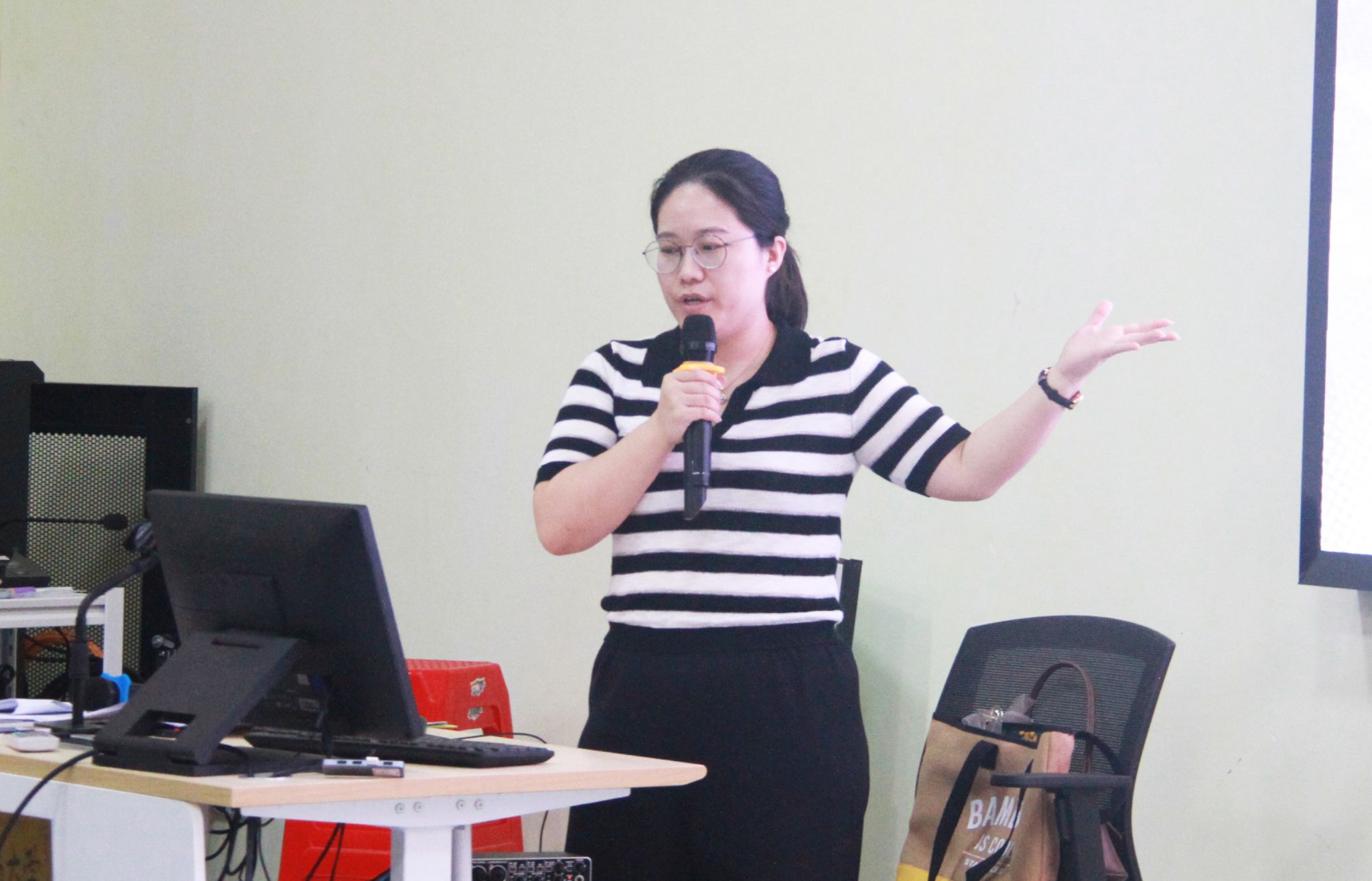 4月17日下午,海南大学热带农林学院25级国际新生迎新活动国际合作交流处孙美慧老师在儋州校区7104教室宣讲。刘新锐 摄。