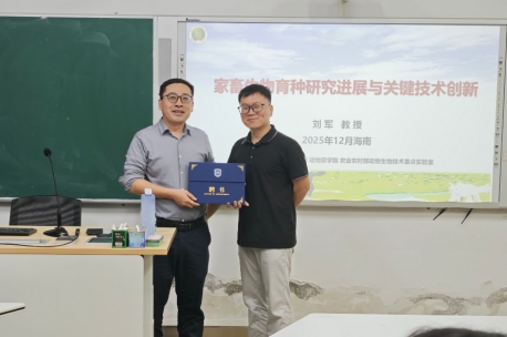 为了拓宽研究生学术视野,提升科研能力,2025年12月21日,海南大学热带农林学院动物科学系邀请西北农林科技大学刘军教授,为2025级畜牧学学科相关专业研究生进行专题讲座。动物科学系副主任李连彬主持活动,对特邀专家表示热烈欢迎,并代表学院为其颁发冬季小学期授课聘书。